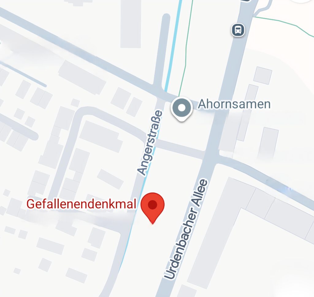 In Sichtweite des „Ahornsamens“ an der Urdenbacher Allee befindet sich das Ehrenmal für die Gefallenen der beiden Weltkriege. Gemeinsam mit der benachbarten Skulptur entsteht eine eindrucksvolle Spannung: Dort das Symbol für Werden und Leben, hier das Zeichen für Verlust und Tod. Dieser Gegensatz prägt die Wirkung des Ortes bis heute.
