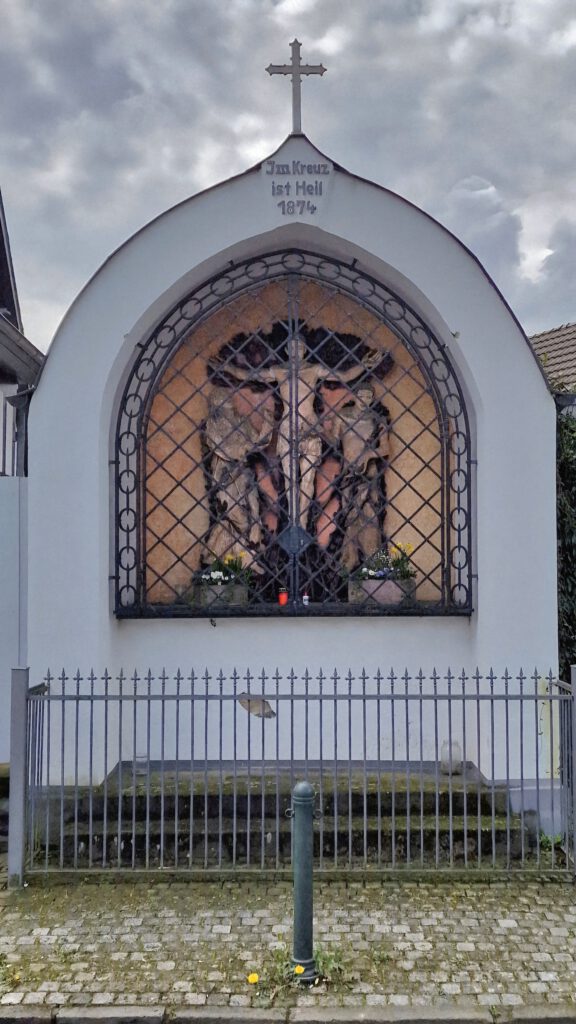 Das schmiedeeiserne Gitter am Hochkreuz wurde vom Düsseldorfer Kunstschmied Peter Ziebarth gestaltet. Es fasst die Anlage ein und unterstreicht ihren sakralen Charakter.
