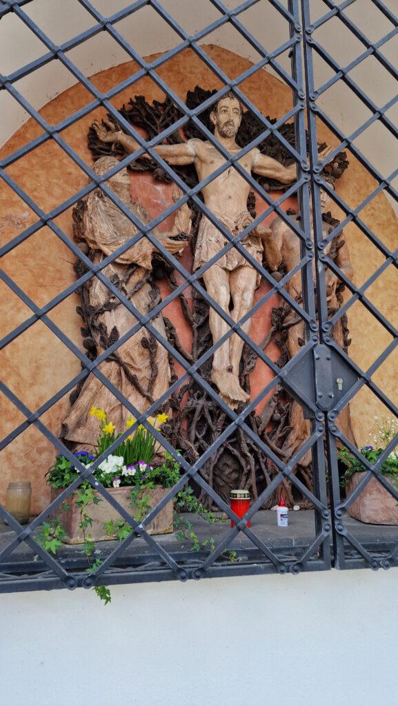 Im Jahr 1987 musste die gesamte Anlage grundlegend renoviert werden. Ein Jahr später erfolgte eine künstlerische Neugestaltung durch Pater Laurentius Englisch OFM. Er schuf eine Terrakottagruppe und gab ihr den Titel: „Christus, der Lebensbaum und das Menschenpaar“. Die Darstellung verbindet das Kreuz Christi mit dem Motiv des Lebensbaums und verweist damit auf Tod und Auferstehung, Hoffnung und Neubeginn.