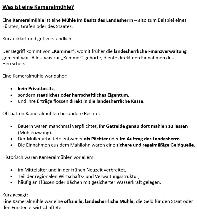 - Nach einem schlimmen Hochwasser in den Jahren 1925/1926 wurde der traditionelle Wassermühlenbetrieb eingestellt: Ab dann lief die Mühle bis 1948 elektrisch.